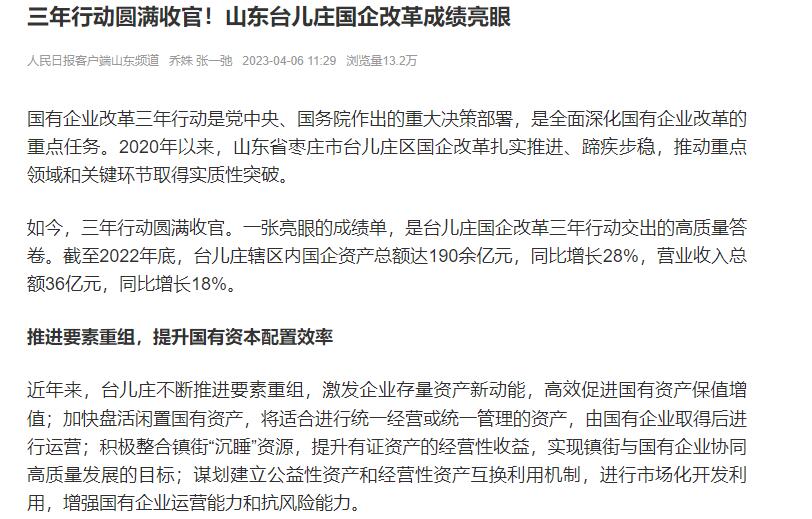 • 人民日報:三年行動圓滿收官!山東臺兒莊國企改革成績亮眼